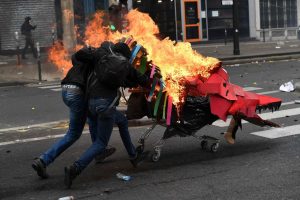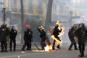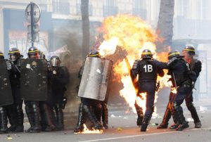 Television pictures showed policemen trying to shake flames from their riot gear, and of tear gas enveloping the streets around Paris’ Bastille monument.