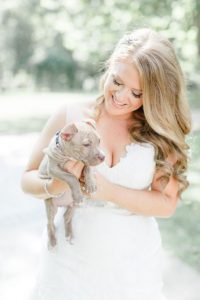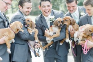 Instead of the typical flower bouquets, the bridesmaids held Boxer-Coonhound puppies from Pitties Love Peace, a non-profit dog rescue organization where the bride works. The five puppies are sisters from the same litter and each is adorably named after a former First Lady: Martha, Abigail, Dolley, Elizabeth, and Louisa. Could it get any cuter? Yes, because the bride held a nine-week-old rescue Pitbull puppy named Biggie Smalls.