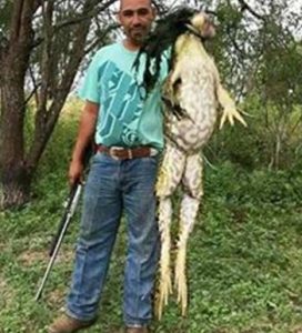 The photo was posted on the South Texas Hunting Association’s Facebook page. It shows Rangel pictured beside a large, 13-pound bull frog that is nearly as tall as he is.