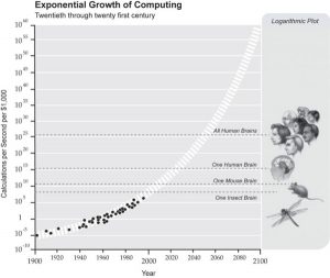 As the globe collaborates and computing power continues to double every year, we are experiencing an acceleration of possibility. The image above, from Ray Kurzweil’s book The Singularity is Near — When Humans Transcend Biology, predicts the computer to be more intelligent than a human brain. Indeed, with the advent of quantum computing, this does seem to be the case.