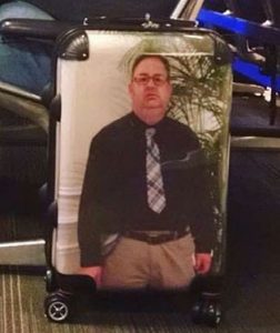 That’s the hero sitting on the seat who had the divine wisdom to plaster his own photo on his suitcase.