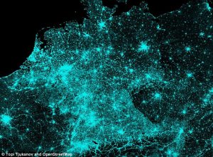 Later that day though he showed some artistic flair when he posted a neon gren-lined road map of Germany on a black background, writing: ‘All #OpenStreetMap roads from Germany (and nothing else). Quite interesting that you can almost see the old East Germany from the data!’