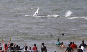 A video shows the whale being refloated in the South Atlantic Ocean with scores of people screaming and shouting for joy.
