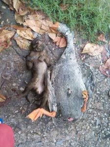 The duck immediately came to rescue the monkey but got entangled as well. Sadly, both of them died on the spot.