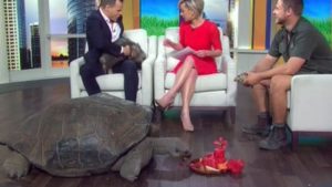 Hugo tucked into a large birthday ‘cake’, made from watermelon and rockmelon, as hosts Tom Steinfort and Deborah Knight discussed the reptile’s potential breeding partners.