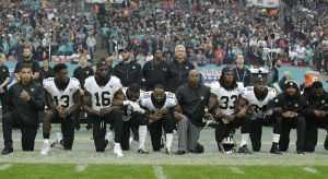 While Miami Dolphins players Julius Thomas, Michael Thomas, Kenny Stills knelt during the anthem, New Orleans Saints players, coaches, and staff knelt before the start of the national anthem but stood in unison once it began at London’s Wembley Stadium on Sunday.