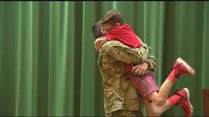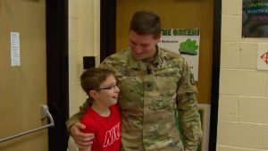As Damon read his essay in front of his classmates, his hero walked out on stage to surprise him after two long years apart and shared the exciting news that he’ll be home until the end of October.